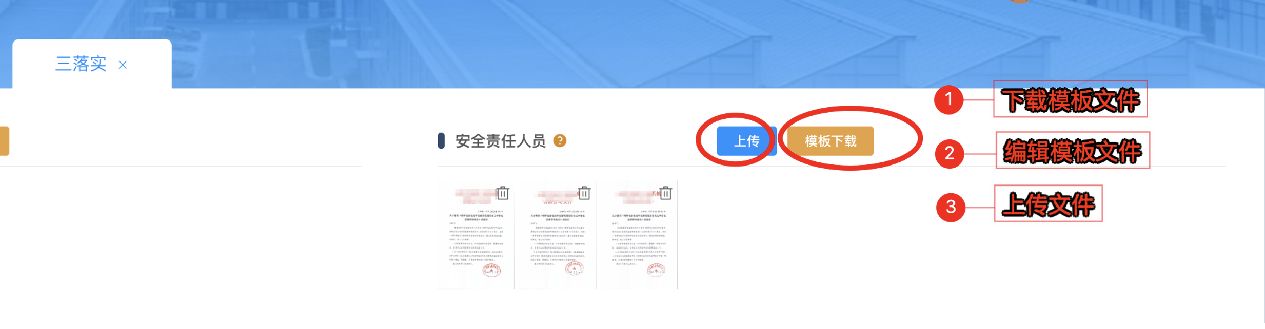 第四步:安全责任人员,管理上传企业安全责任人员管理红头文件,如图<三落实示意图3>所示